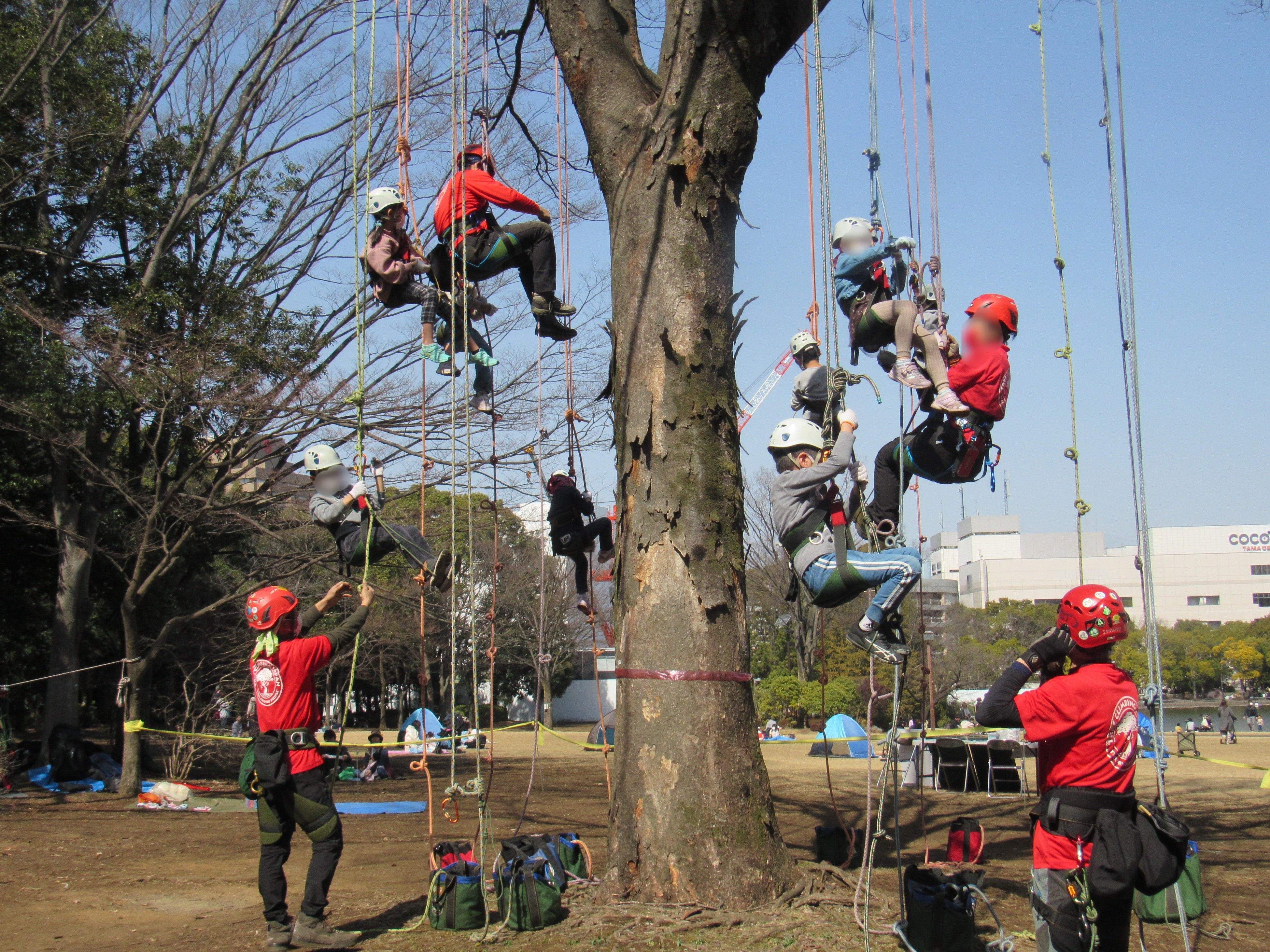 多摩中央公園大芝生広場のケヤキの木でツリークライミング体験