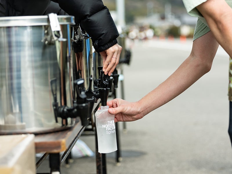 今回が初めての開催となる「せとだレモンマラソン」は、地元住民、企業、行政が一体となり運営する、地域活性化を目的に実施される大会です。『「ヒト」も「まち」も健康になるマラソン大会』を掲げる本大会のの取り組みの一つとして、大会運営における環境負荷低減を目指し、通常の大会で見られるような給水ポイントで使用する大量の紙コップ、プラカップやペットボトルなどを全廃しました。参加ランナーは自身でマイボトル、マイカップを持ちながら走り、コース上の給水ポイントに設置された給水タンクや給水ジャグから水を汲みました。これは、2022年12月にゴールドウインとザ・ノース・フェイスがサポートした「第17回湘南国際マラソン」で初めて実施したマイボトルマラソンのフォーマットを採用したものであり、「スポーツを通じて、豊かで健やかな暮らしを実現する」という企業理念のもと、地球環境を改善する循環型社会の実現に向けての取り組みを行っているゴールドウイン、ザ・ノース・フェイスが提案し進めてきた新たなマラソン大会のスタンダードとしたい取り組みです。