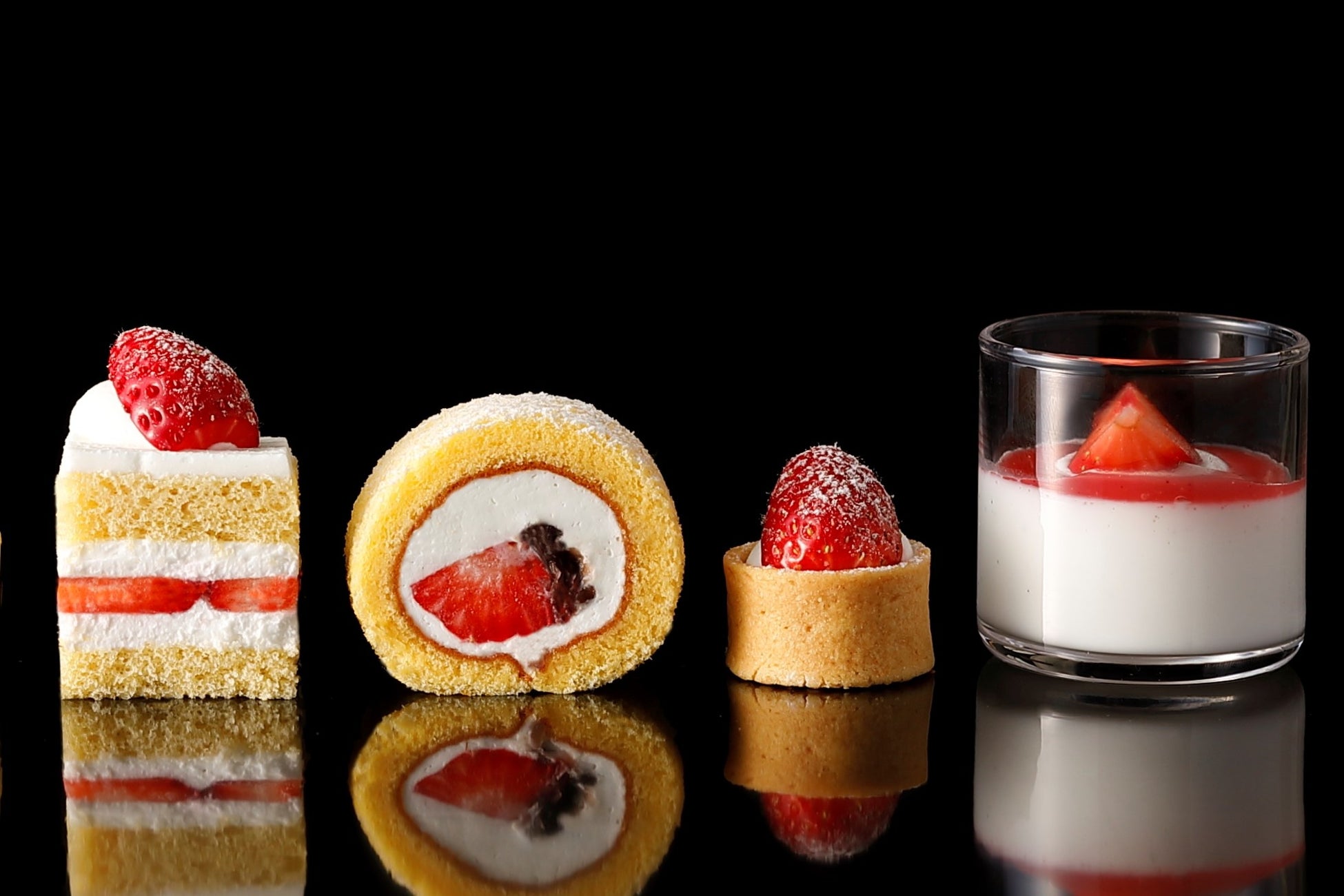 その他にも、ふんわりとしたロール生地であまおう・生クリーム・黒蜜あんこを包み、ルビーチョコレートを表面にあしらった和テイストの『あまおうロール』、サクサクの生地がたまらない『あまおうタルト』、たっぷりのいちご果汁との相性抜群な『あまおうパンナコッタ』など、多彩なラインアップのあまおうスイーツをお好きなだけお愉しみいただけます。