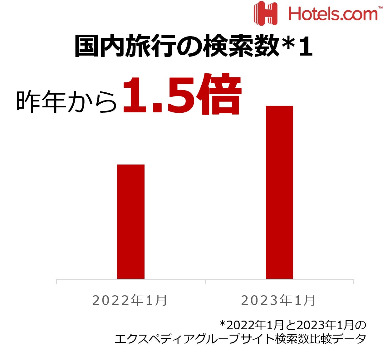 実際、エクスペディアのデータによると、2023年1月時点での国内旅行の検索数*1が昨年同時期と比較して1.5倍に増えており、新型コロナウイルスの感染状況がようやく落ち着きを見せた今、国内旅行の需要が回復していることが分かります。