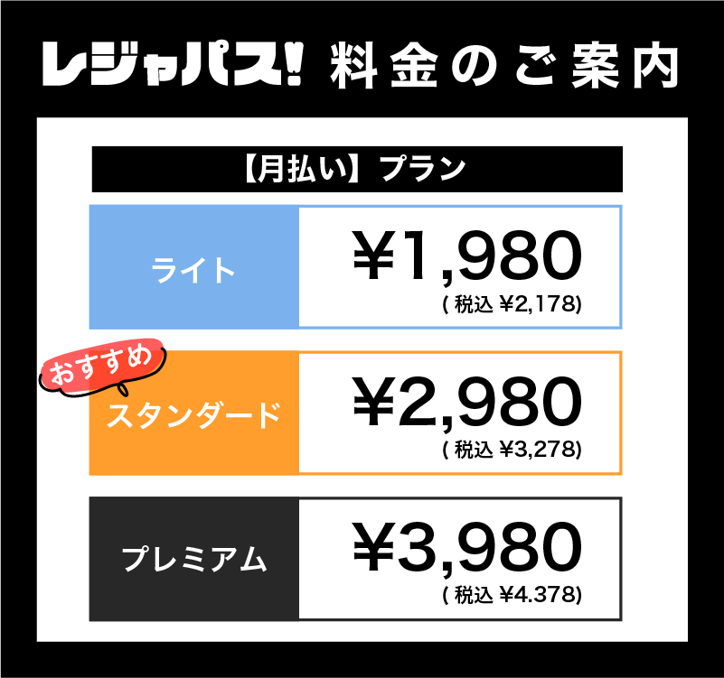 遊園地・水族館・動物園・美術館・温泉・キャンプ場など、全国165以上のさまざまなジャンルを利用できる定額制サービスです。直近では、レジャーのみならずスポーツ観戦や観劇など幅広いジャンルに拡大しています。