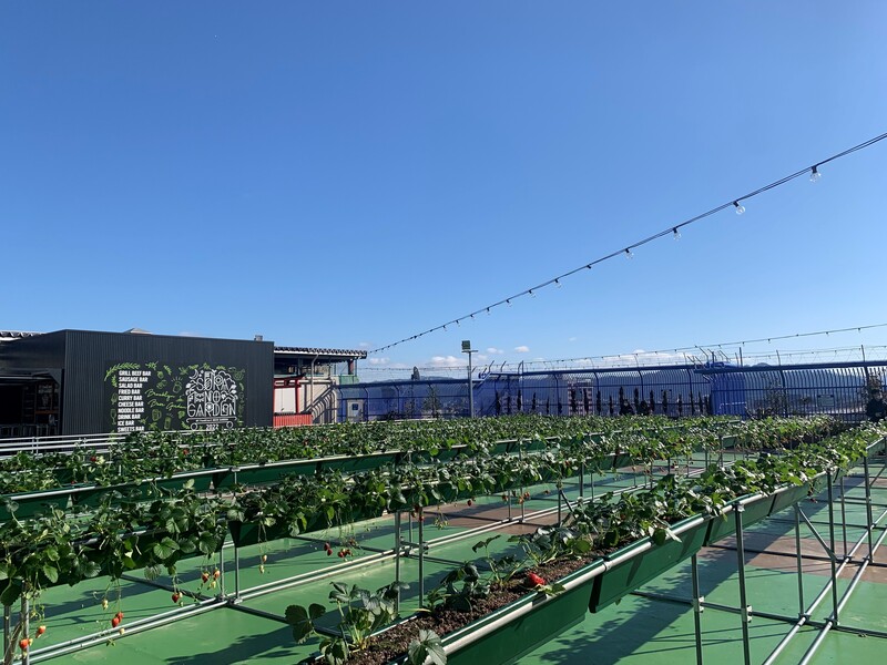 1.福井の山々を臨む屋上で爽快気分のいちご狩りといちごスイーツを楽しむ
