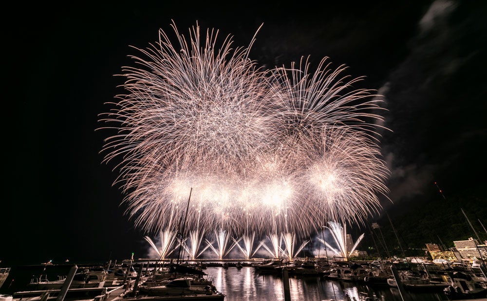 熱海海上花火大会は、1952年(昭和27年)にはじまった歴史ある花火大会。夏だけではなく年間を通して15回以上も開催されている熱海名物の花火大会です。夜空に広がる花火や、水面に映る花火、そして、フィナーレを飾る「大空中ナイアガラ」の美しさは、瞬きを忘れるほど!心にずっと残る思い出ができる、熱海海上花火大会ならではのイベントです。