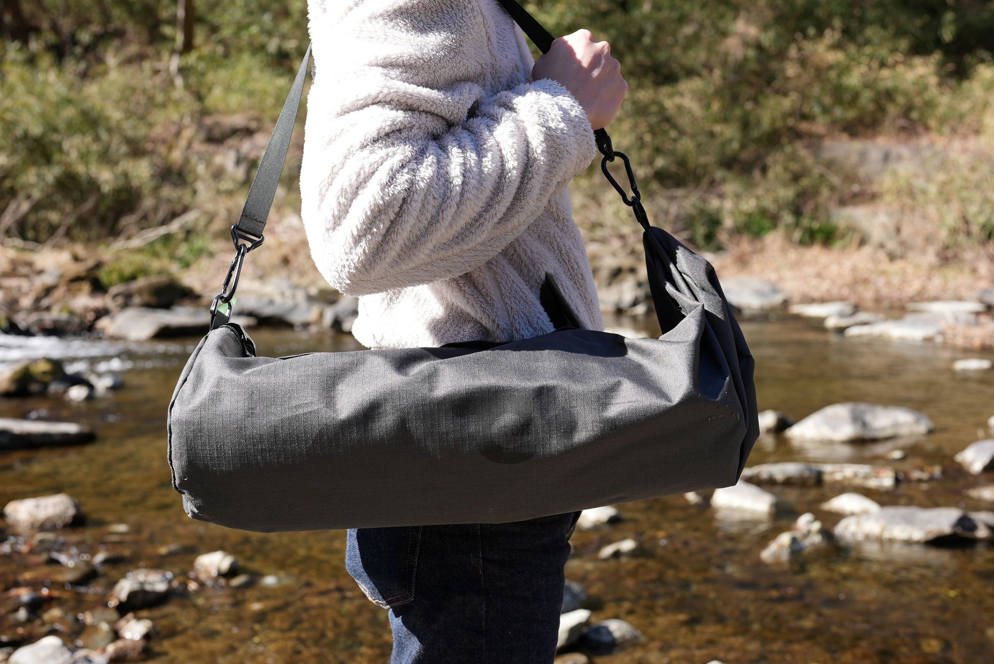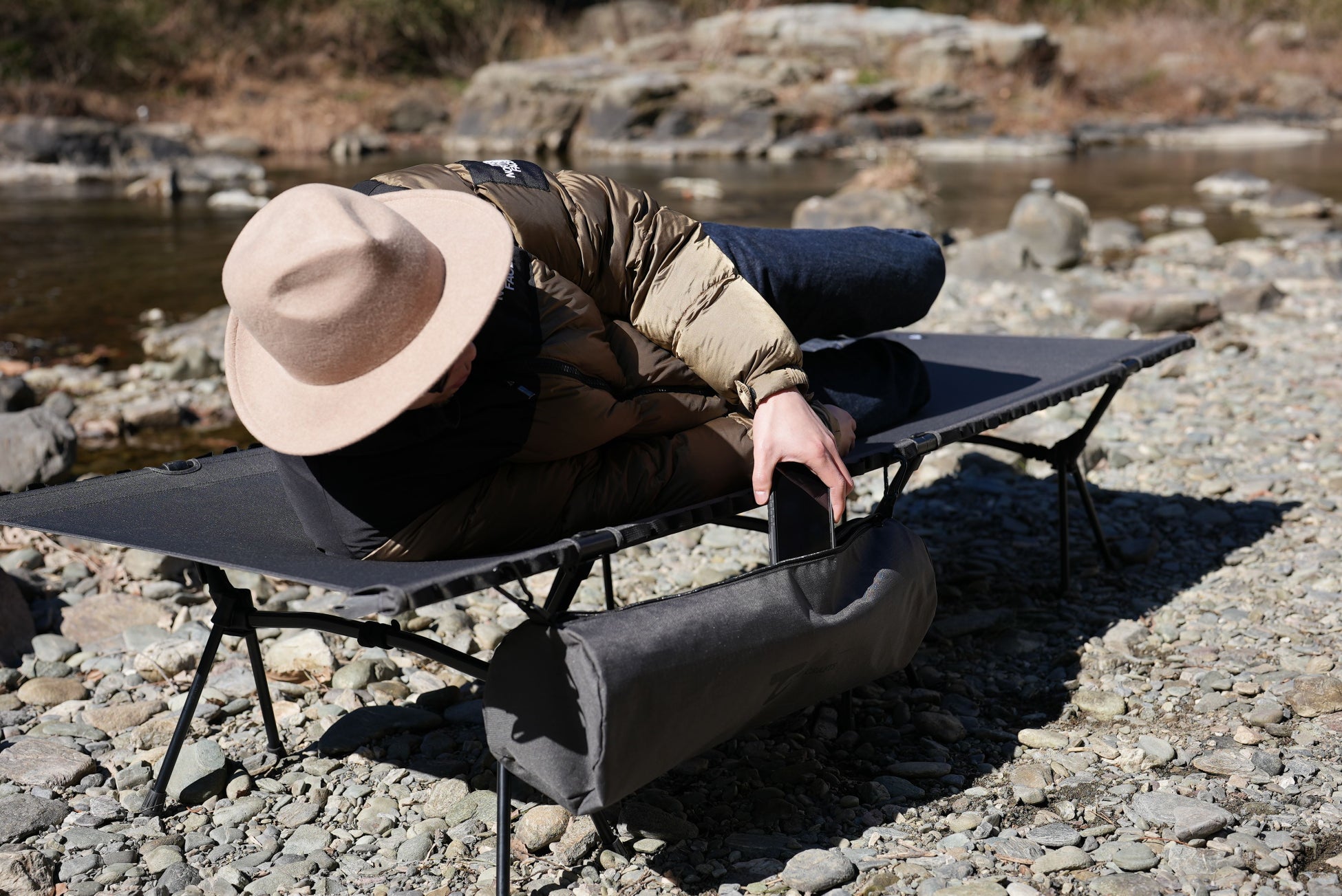 収納ケースの汎用性が高く、付属のカラビナを使って、ウェビングにかけて小物入れにしたり、収納ケースに衣類を入れて枕代わりにすることも可能です。その枕を両側のウェビングにカラビナで固定し、ズレを防ぐこともできます。小物入れやベンチ、ベッドなど様々なシーンで活躍するコットは、快適に寛ぐ、眠ることができ、手放せなくなるアイテムです。