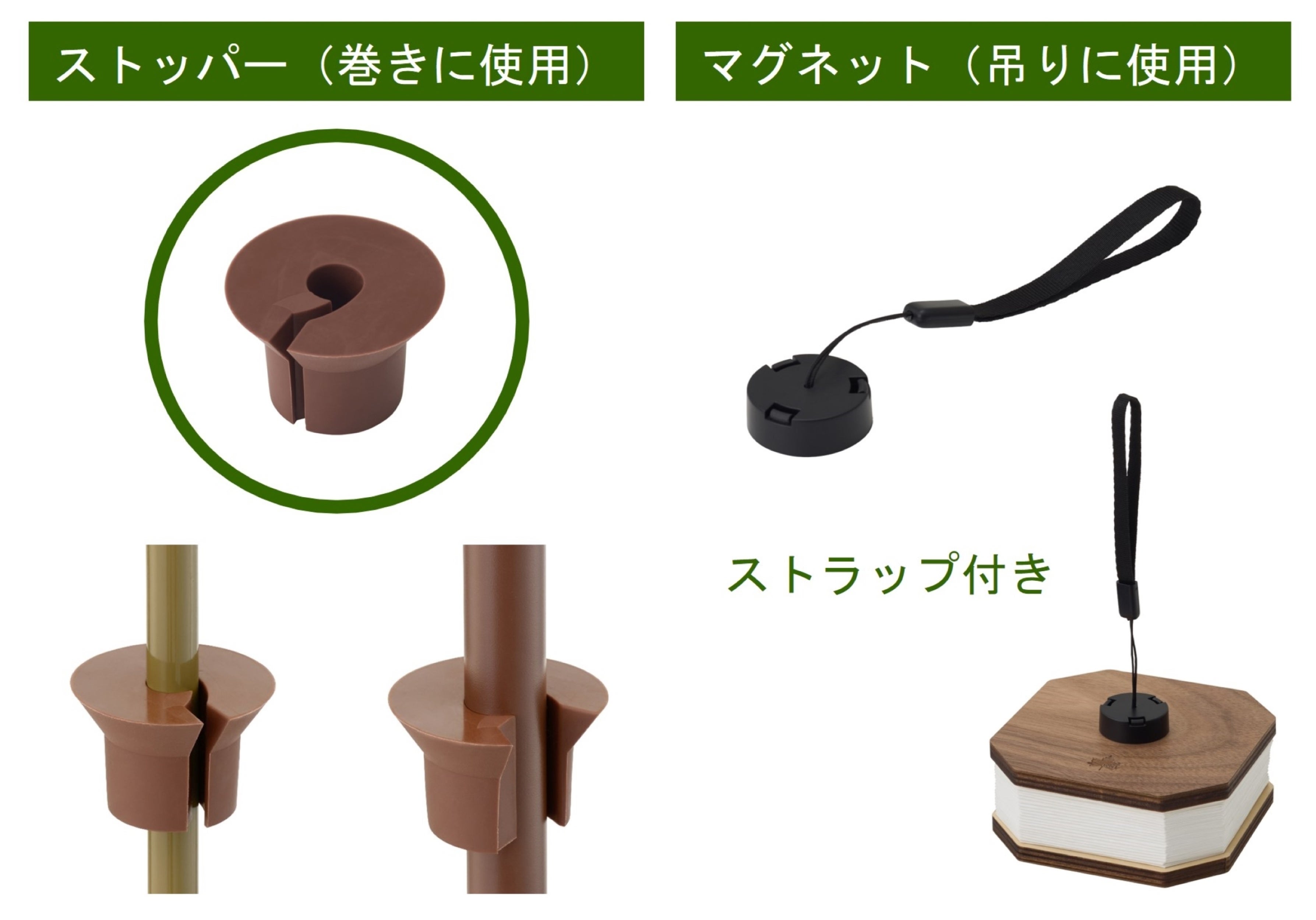 便利な付属品である、ランタンポールに巻き付ける際に使用するストッパーと吊るす際に役立つマグネットがあるのでさらに便利。シリコン製のストッパーはポールの太さに関係なくしっかりと取り付けられるので安心。マグネットはストラップ付き。