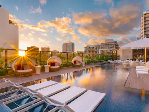 ワイキキ中心部クヒオ通り沿いに2017年1月オープンの新規ホテル。ロイヤルハワイアンSCへは1ブロック、インターナショナルマーケットのお隣に位置する立地抜群のホテルです。客室は、機能的かつ上質で落ち着きのあるモダンなデザイン。22フロアあり各お部屋はユニークなレイアウトになっています。ロビー階は8階にあり、ホテル内レストラン、バー、スプラッシュラウンジ等、ワイキキの喧騒を離れたプライベートな空間が広がっています。
