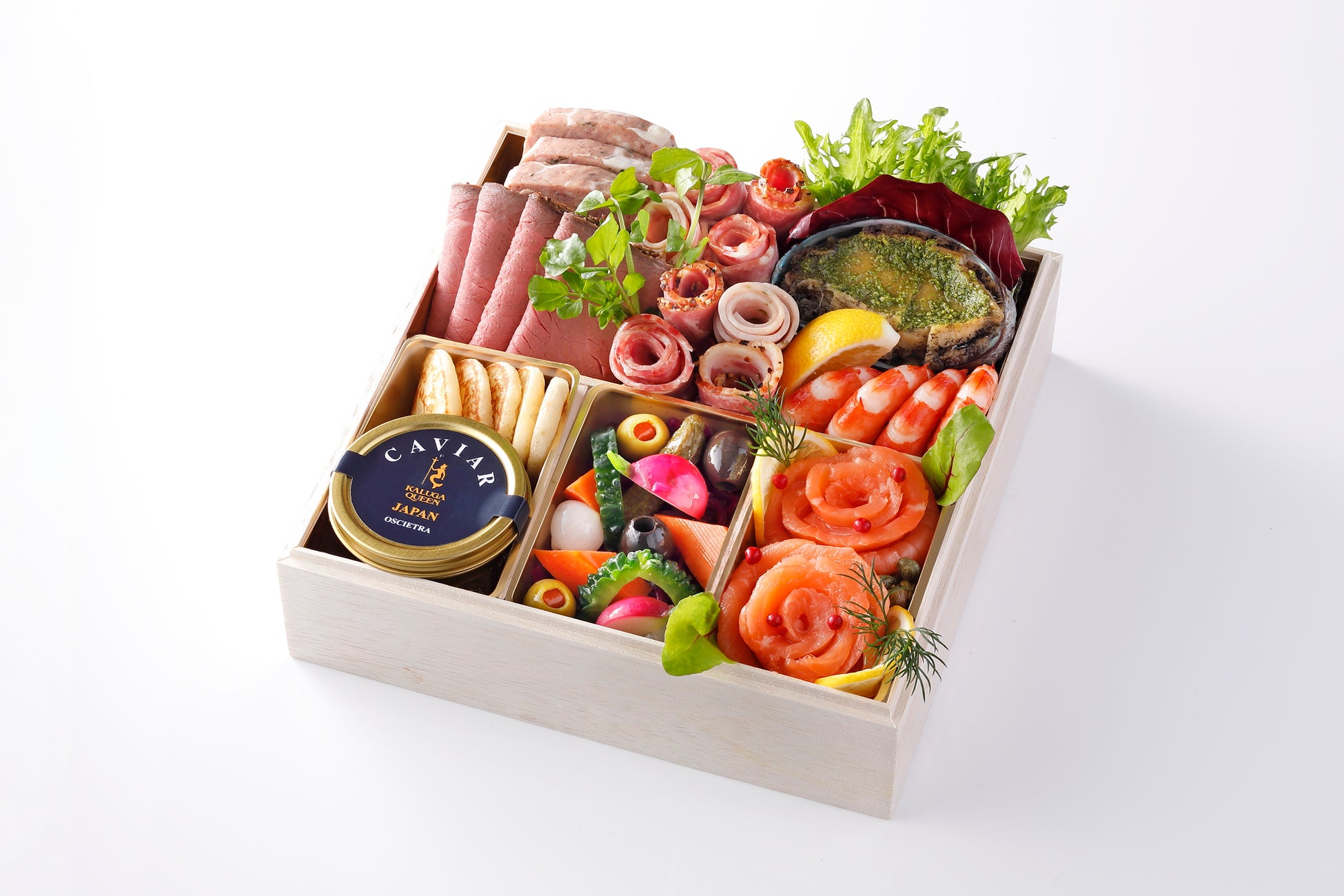 フレンチオードブルスタイルで色鮮やかにご用意する弐の重には、ローストビーフをはじめとするコールドミートや、大ぶりの鮑のジェノベーゼ、キャビア&ブリーニなど味はもちろん見た目も華やかな贅沢食材を存分に詰め込んだ一段をご用意いたしました。