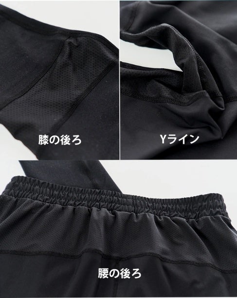 ・汗をかきやすい、膝のうしろ、腰のうしろ、Yラインにはメッシュ素材を採用し快適なフィット感実現
