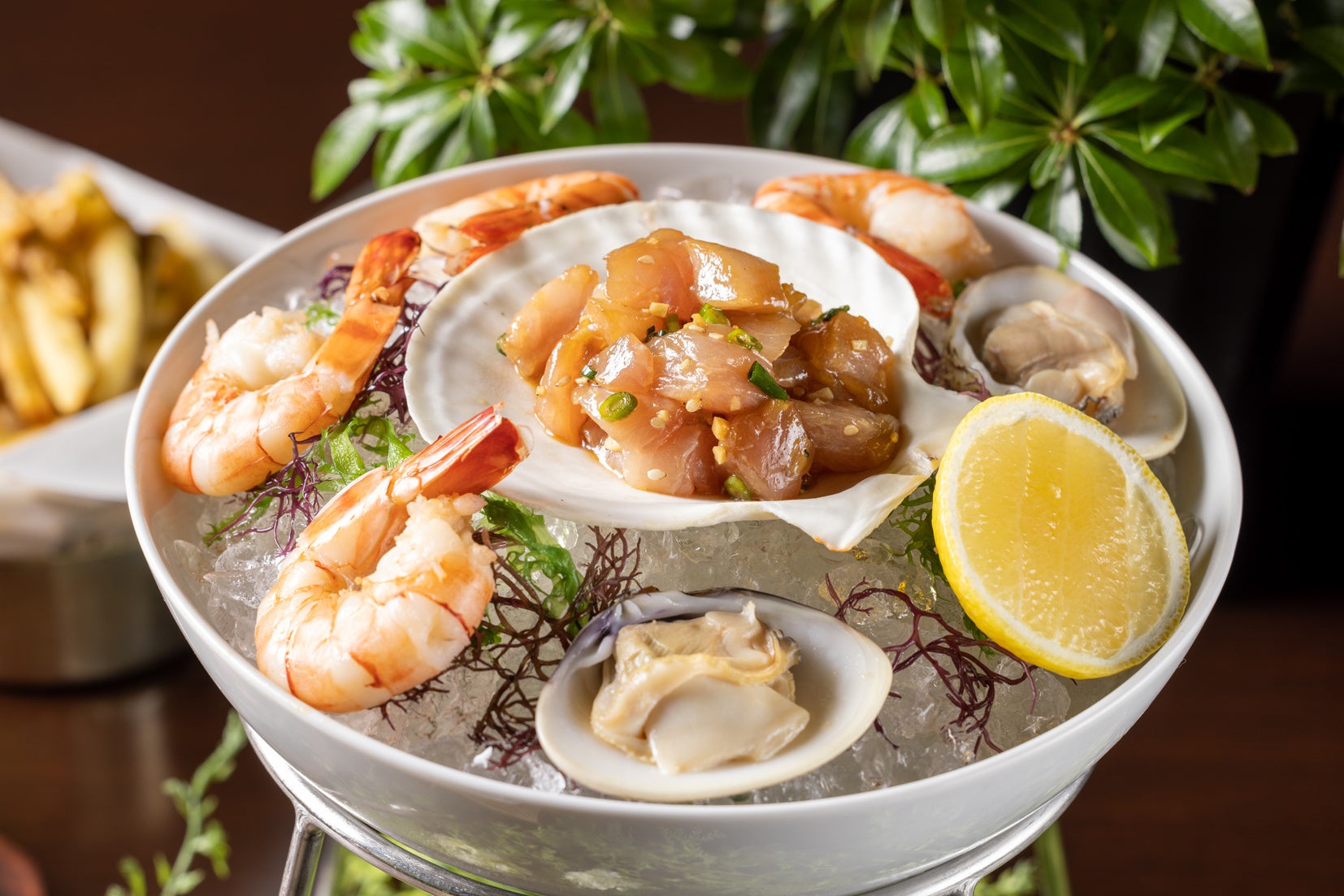 厳選した素材をダイナミックに調理するステーキハウス「オーク ドア」では、開放的なテラス席で都会の夜を満喫できるボリューミーで満足感の高いスペシャルなコースを用意しました。コースの主役は、20周年にちなみ、総量「20オンス(約600グラム)」の肉や魚介類が乗ったグリルプレート(2名様用)。チャコールグリルと900度に達するブロイラーオーブンで焼き上げる、ビーフサーロインやラムチョップ、チキンなどのグリルに加えて、オリジナルのハーブバターがたっぷりと乗ったロブスターや肉厚で大振りなホタテの