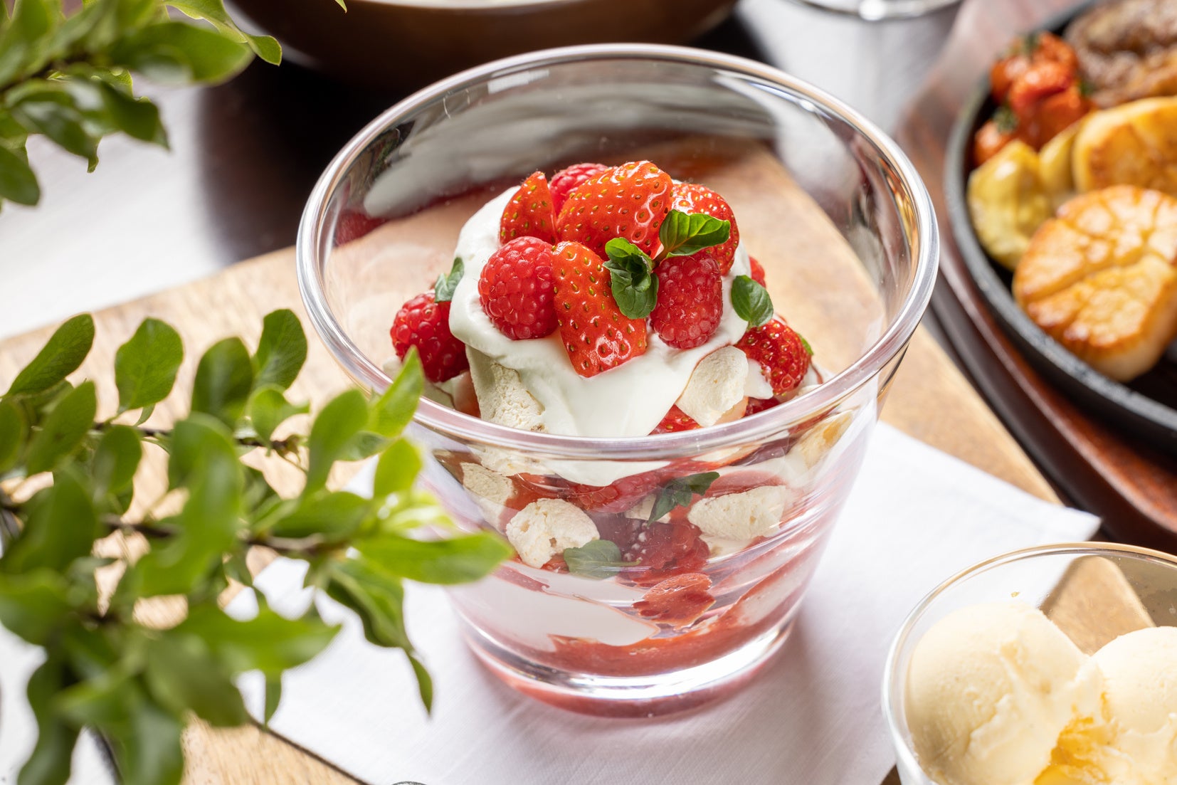 ローストなど、見た目のインパクトも抜群の満足感の高い一皿です。そのほか、歯ごたえがくせになるロメインレタスやスモークベーコン、アンチョビが効いたオリジナルのドレッシングが特徴のシーザーサラダ、シーフードカクテル、フレッシュのベリーやベリーソースの酸味、メレンゲの食感が楽しい「オーク ドア」スタイルのパブロバなど全6品のコース。サラダからデザートまで「オーク ドア」の人気シグネチャーメニューが一気に揃う豪華なコースを、春風が吹き抜ける開放的なテラスでぜひお楽しみください。