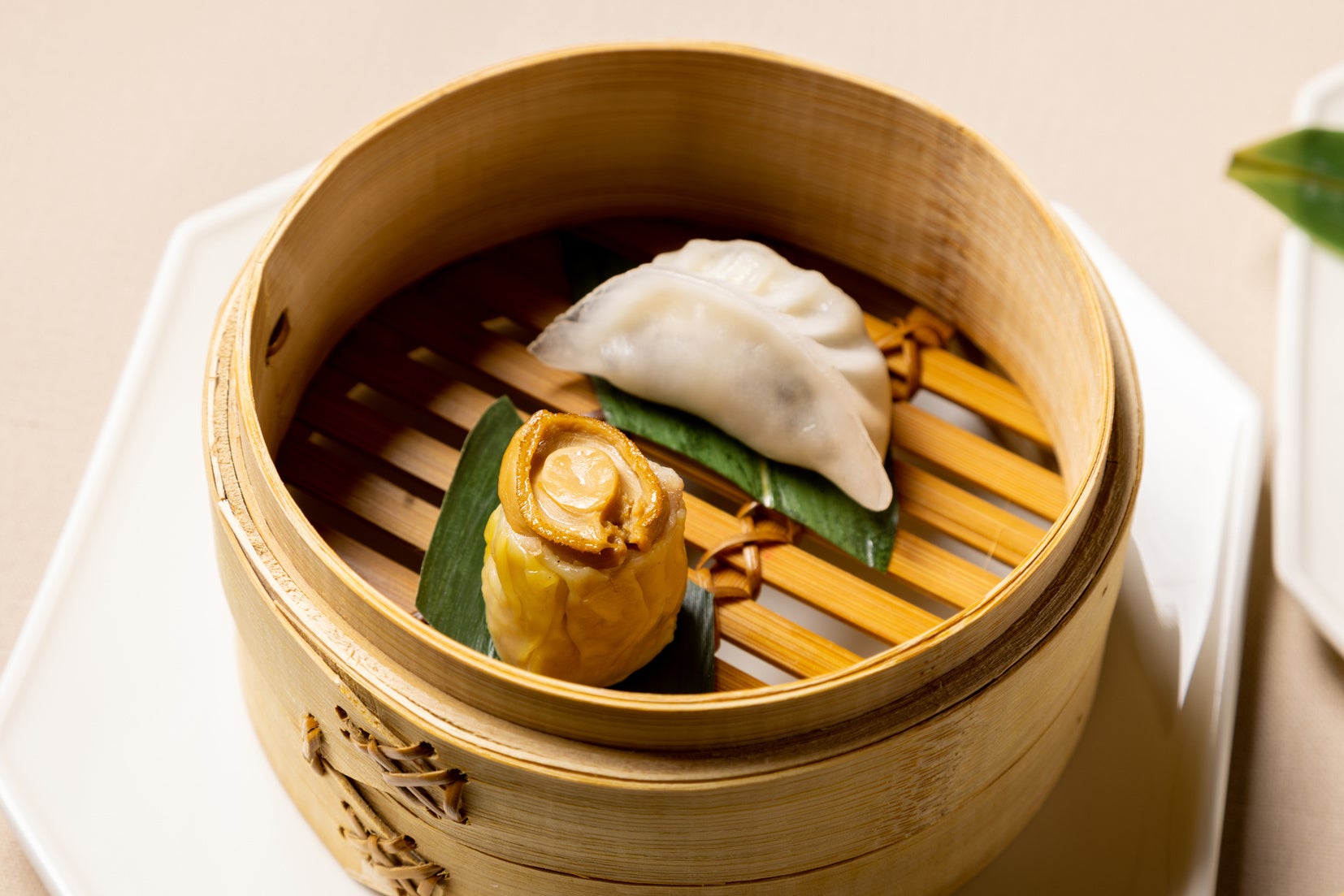 点心: 豚肉と海老の焼売 鮑のせ、トリュフ入りホタテ蒸し餃子