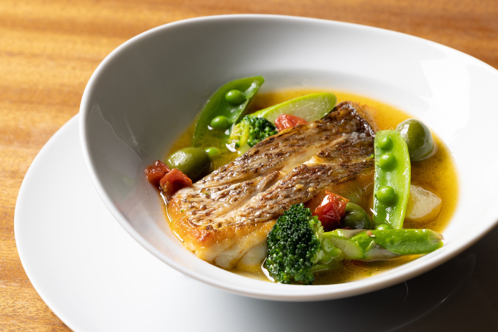 カンパーニア州の州都である港湾都市ナポリを代表する郷土料理のアクアパッツァ。主役の白身魚には、春に旬を迎え、しっとりとした食感と旨味が楽しめる愛媛県産の真鯛をチョイスしました。真鯛の淡白な旨みに加え、スナップエンドウやアスパラなどの春野菜の甘みをしっかりとお楽しみいただけるように、二枚貝やエビなどの魚介は使用せずに仕上げています。シンプルながらも魚介の味わい豊かな一皿です。