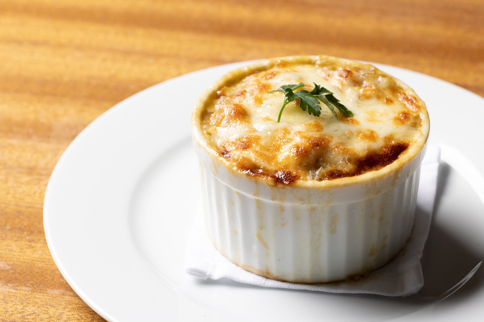 じっくりと時間をかけて炒めたヒヨコ豆と、オニオンやセロリなどの野菜の旨みが楽しめる、素朴で優しい味わいが特徴の食べるスープです。コトコトと煮詰めた野菜スープを覆うのは、ナチュラルチーズをスモークしたモリーゼ州特産のスカモルツァのほか、パルメザン、モッツアレラの3種のチーズ。黄金色に色づいたトロリととろけるチーズが食欲をそそる、食べ応えもあり満足感も高い一品です。
