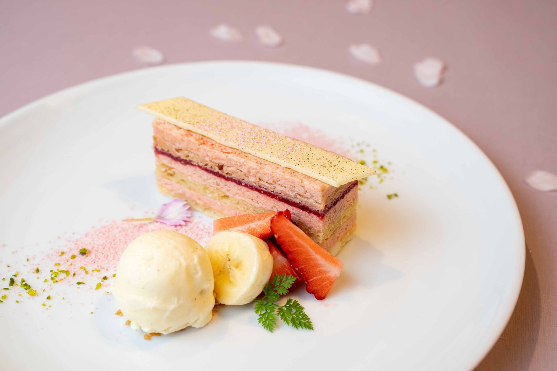 季節のアフタヌーンティーは、『Sweet Spring スイートスプリング』をテーマに、春をイメージした優しいピンクカラーのグラデーションが愛らしいスイーツが並びます。苺、ラズベリーをメインに、香り、酸味そして見た目の可愛さにこだわりました。そして季節のケーキには、淡いピンク色を基調に苺の様々なバリエーションを楽しめる『苺のオペラ、バニラアイスクリーム添え』をご用意いたしました。