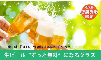 海の家「OLTA(オルタ)」で、生ビールが飲み放題になる「OLTA」ロゴ入りオリジナルグラスです。