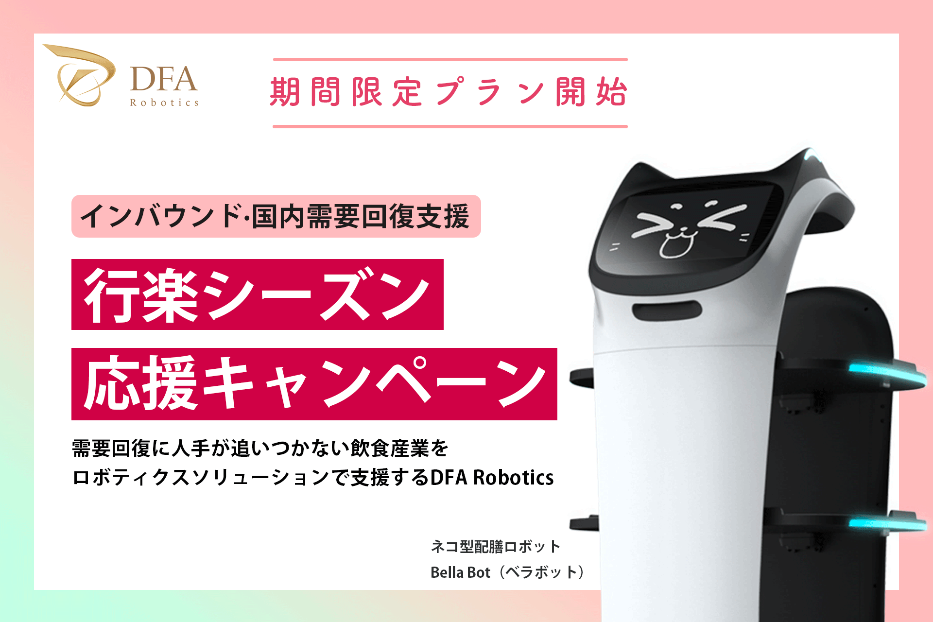 飲食店DXを推進するロボティクスソリューションカンパニーである株式会社DFA Robotics(本社:東京都渋谷区恵比寿 代表取締役:波多野昌昭)は、提携するPudu Robotics社(本社:中国深セン、日本法人Pudu Robotics Japan 株式会社 代表取締役社長:張涛)が提供するネコ型配膳ロボット「Bella Bot(ベラボット)」をはじめとする配膳ロボットの期間限定特別価格レンタルプラン「行楽シーズン応援キャンペーン」を、サービスロボット導入を検討する企業のみなさまを対象に提供を開始いたします。