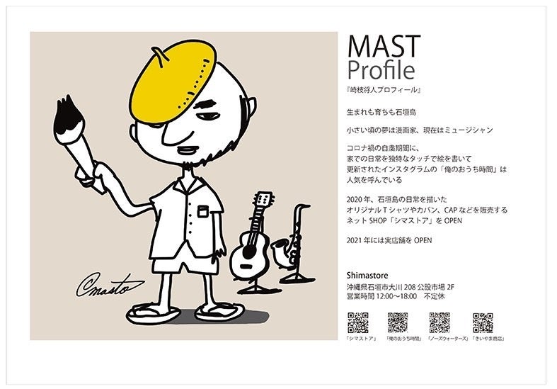 コロナ禍の自粛期間に、家での日常を独特なタッチで描いて更新したインスタグラムの「俺のおうち時間」は人気を呼び、2020年石垣島の日常を描いたオリジナルTシャツやカバン、CAPなどをネットSHOP「シマストア」にて販売開始、2021年には石垣島に実店舗をOPENしました。