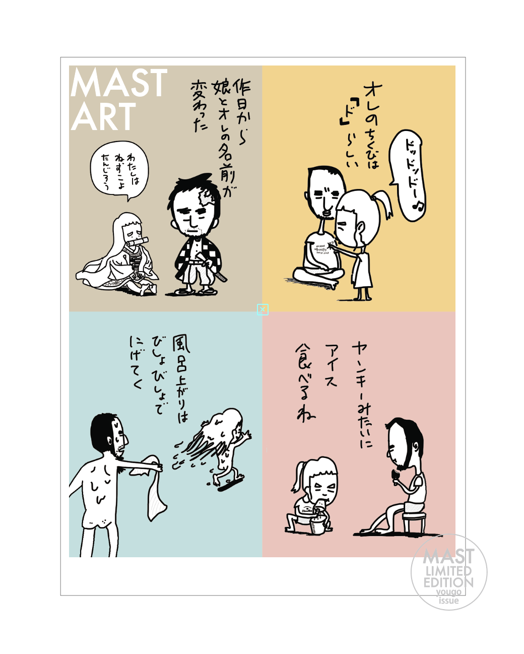 ミュージック以外のマストのもうひとつの魅力は「画力」。インスタグラム『俺のおうち時間』で人気のイラストレーションを版画作品で発表します。自分自身の生活、子どもとの会話、思わずニヤリとさせられる、愉快な作品となっています。