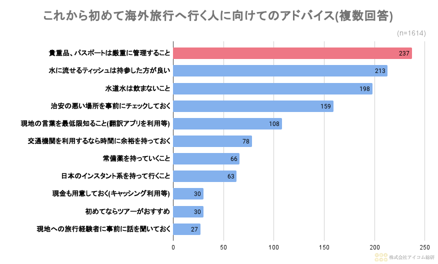 当たり前の内容かもしれませんが、やはり海外経験者も様々な現地での体験をしており、一番多い回答としては「貴重品、パスポートは厳重に管理すること(237票)」になりました。