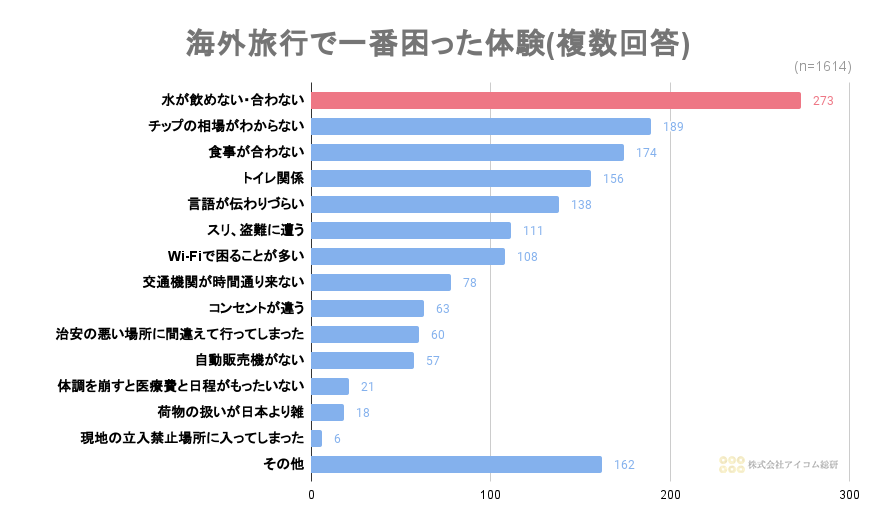 一番多い困った経験は、お水の問題(273票)で、「水道水が飲めないこと」「購入した水も合わない」「レストランやホテルの水が合わない」など、水について困惑した方が圧倒的多数を占めました。