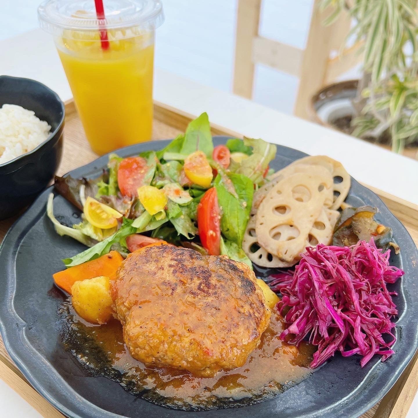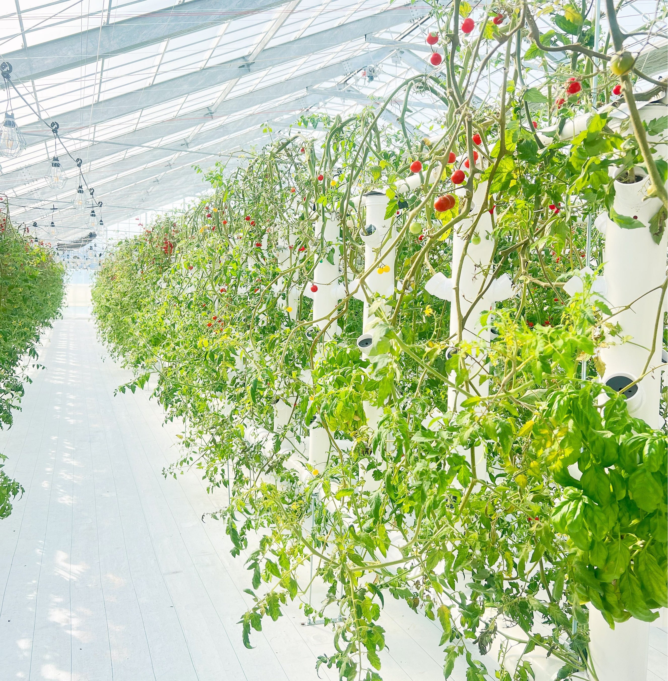 オニテナガエビとトマトの小さなアクアポニックスや、シャインマスカットなどの木が広がる、緑に囲まれた癒しの空間となっています。カフェの食材はハウス内で“パーフェクトオーガニック”にこだわり栽培したトマトやバジル、サラダミックスなど、安心で安全なお食事をお楽しみいただけます。さらにオニテナガエビとトマトのスープやフレッシュなバジルをふんだんに使用したオリジナルバジルソースなど、6次産業化した商品もご用意しております。