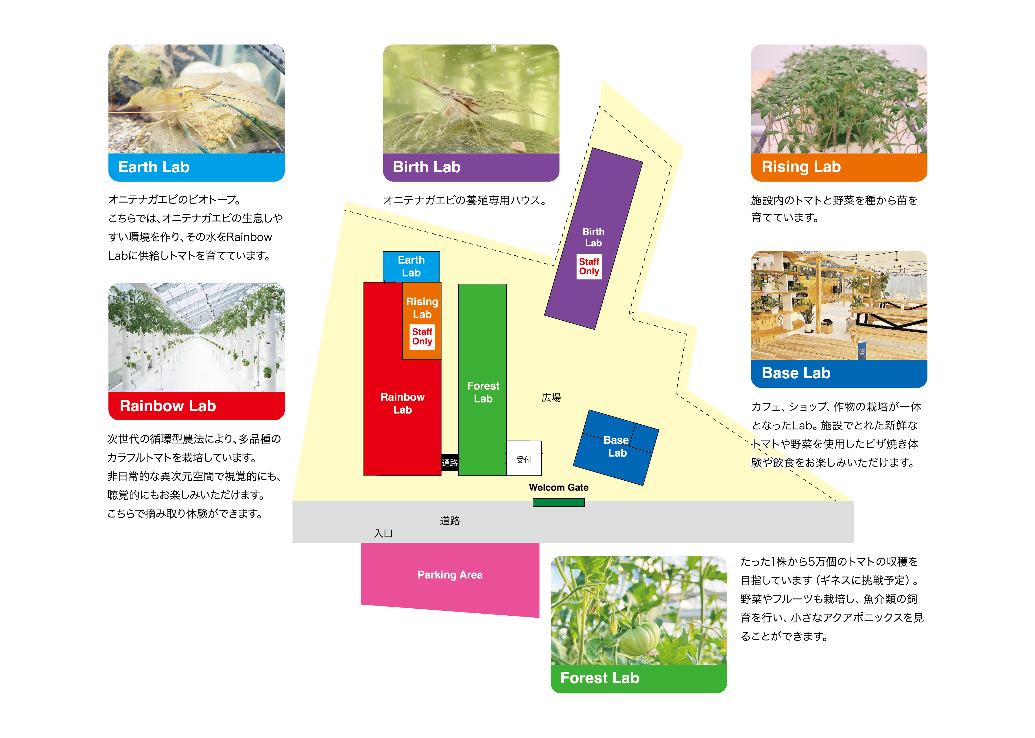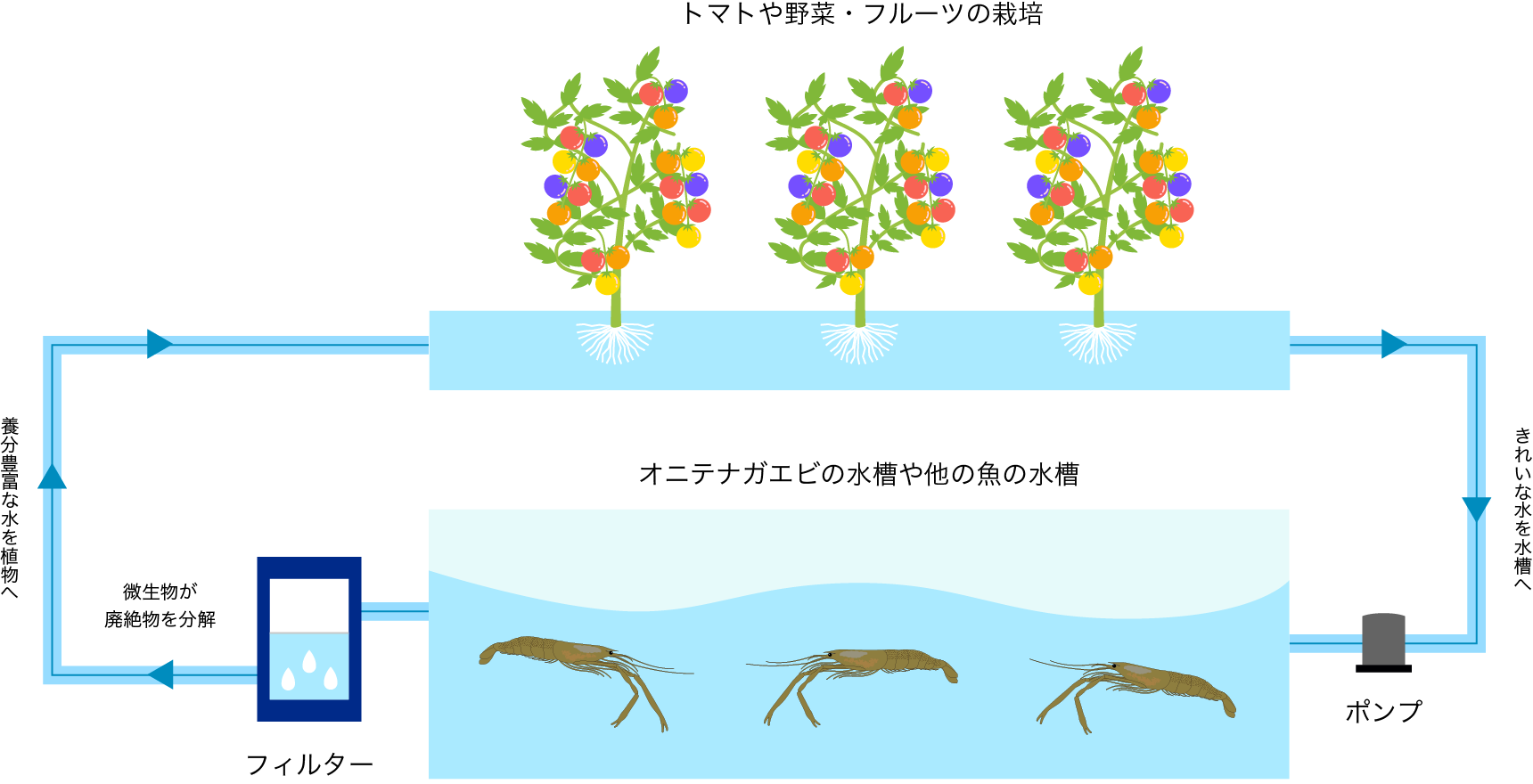 BIWAKO AQUA PONICSは滋賀県高島市針江に位置し、水の街ともいわれる湧水が豊富な恵まれた地域の水を給水し、次世代のアクアポニックス農法により、オニテナガエビの養殖を行いながら、その養分豊富となった水をトマト狩りができる500本以上のパイプシステムに送り込み、カラフルトマトの栽培を行っています。さらにトマトの根を通った水は、養分のみを吸収し綺麗な水となり、またオニテナガエビの水槽に戻っていくという、一切排水無しの環境にも配慮した完全循環式の体験型農園です。