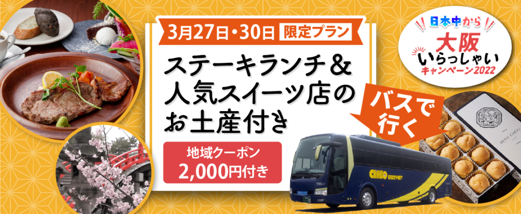 株式会社フォーティーズ(本社:大阪市鶴見区、代表取締役 岡武史)は大阪府の全国旅行支援「“日本中から”大阪いらっしゃいキャンペーン」対象商品 3月27日(月)・30日(木)限定プラン《全国旅行支援》 ステーキランチ&人気スイーツ店のお土産付き 『桜を見る会』日帰りバスツアーのオンライン販売を開始しました。