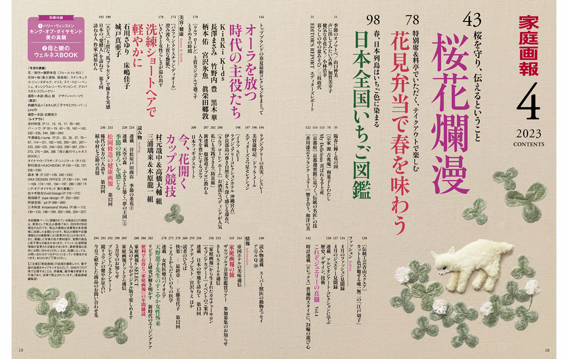 株式会社世界文化社は、『家庭画報 4月号』を3月1日(水)に発売しました。今号は「一度は見たい桜の名所 桜花爛漫」「花見弁当」「日本全国 いちご図鑑」など、1冊まるごと春の輝きを詰め込んでお届けします。また、注目のフィギュアカップル競技・村元哉中&高橋大輔 組、三浦璃来&木原龍一 組 の特別取材、篠山紀信さん撮影によるトップブランドの春夏最新コレクションを纏った KinKi Kids、眞栄田 郷敦さん、宮沢 氷魚さんほか 豪華7組が登場。撮りおろし&インタビュー満載の号となりました。
