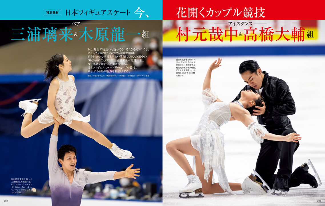 結成3年目、全日本選手権で悲願の優勝を果たしたアイスダンス 村元哉中&高橋大輔 組、そしてグランプリファイナルに続き、 四大陸世界選手権でも日本人初の優勝を果たした、ペア 三浦璃来&木原龍一 組の撮り下ろし・特別インタビューを掲載します。3月の世界選手権に益々期待のかかる2組に、今の率直な気持ちを伺いました。※ 「日本フィギュアスケート 今、花開くカップル競技」 特集内の写真は、通常版とプレミアムライト版で一部絵柄が違います。