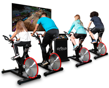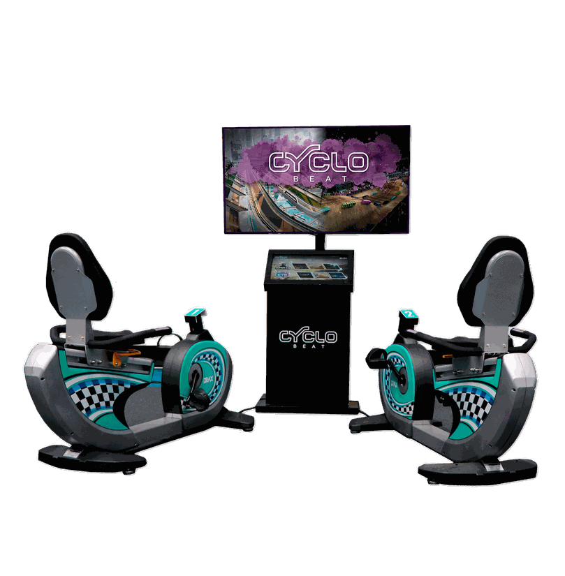 “cycloBEAT”(シクロビート)は専用のエクササイズバイクを漕いでプレイするエクサゲームです。エクササイズバイクで発生したパワーがリアルタイムでバーチャルバイクに伝達され、ゲームに反映されます。ギアを上げればより大きなパワーを生み出し、よりエキサイティングにゲームを進めることができます。