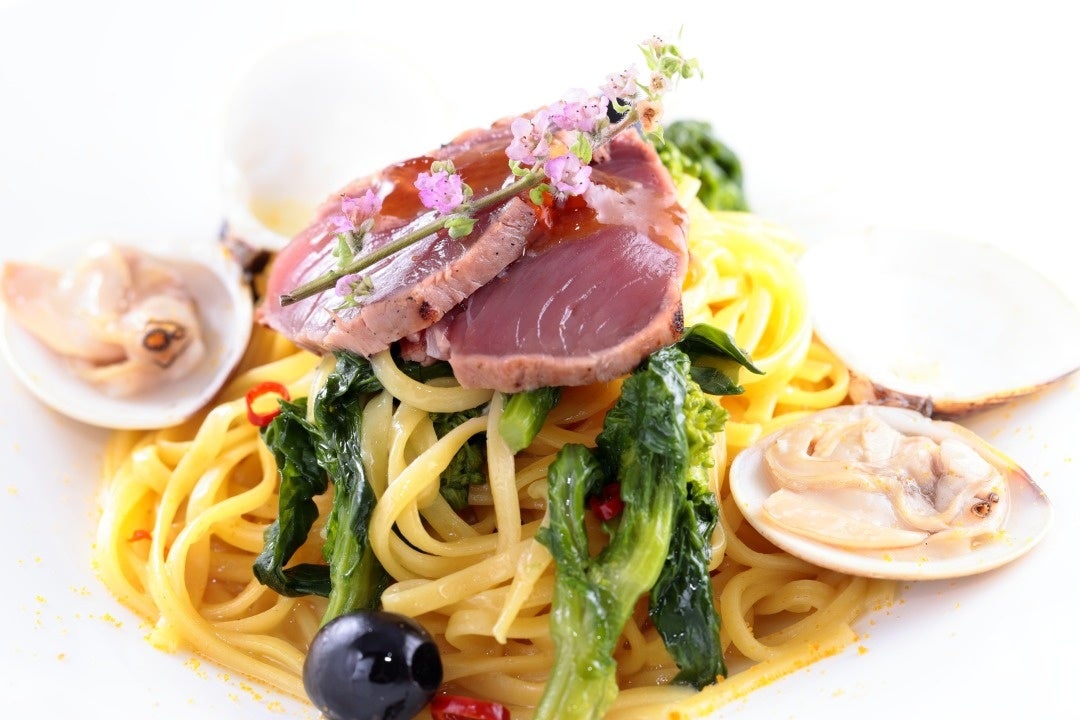 プリプリのハマグリと初カツオを使⽤した⿂介の旨味 がつまったボンゴレビアンコ ボッルガの塩気も味のアクセントに楽しめる⼀⽫