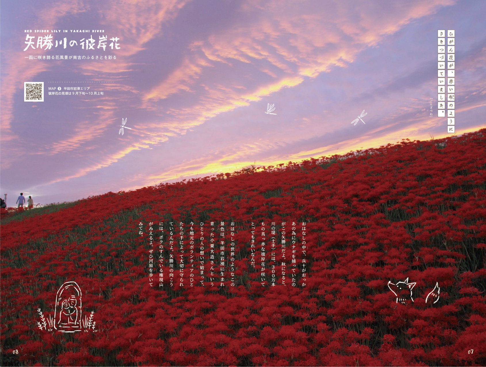 童話「ごんぎつね」の舞台である童話の森や、秋には300万本余りの彼岸花が咲き誇る⽮勝川、その他半田市の主要観光スポットや見どころイベントを新美南吉童話を切り口に紹介しています。新美南吉のファンに限らず、作品を多く知らなくてもガイド片手に巡ることで新美南吉のふるさとの風景を一日中楽しむことが出来ます。