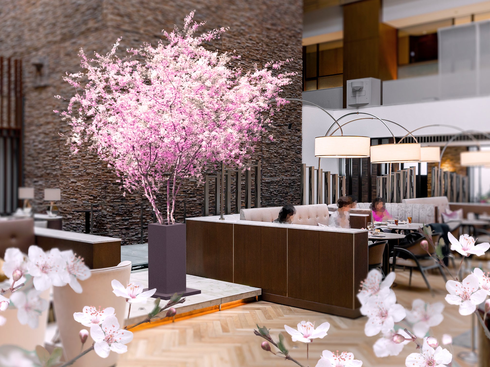 春の訪れを感じる桜×いちごの最強コンビネーションをぎゅっと凝縮した、可憐なアフタヌーンティーとともに愉しめるのはプロジェクションマッピングによる桜のアートツリー。地上26階という高層階にいながら、花びらがふわりゆらめくような美しい情景を満喫していただけます。