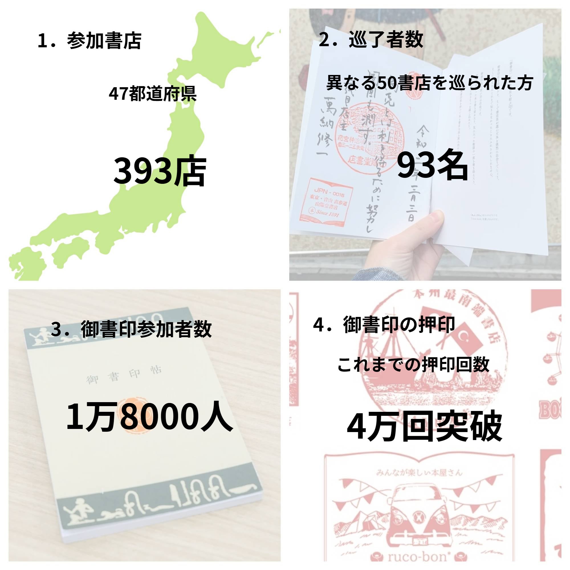 御書印参加書店は、2019年からの3年間で47都道府県、北は北海道利尻島、南は沖縄石垣島まで393店(※1)になりました。巡了者(異なる御書印店で50個の印を集めた方)は93名。複数回巡了した方は、11名います(※2)。同一人物での最多巡了回数は6回(300店以上)になります。