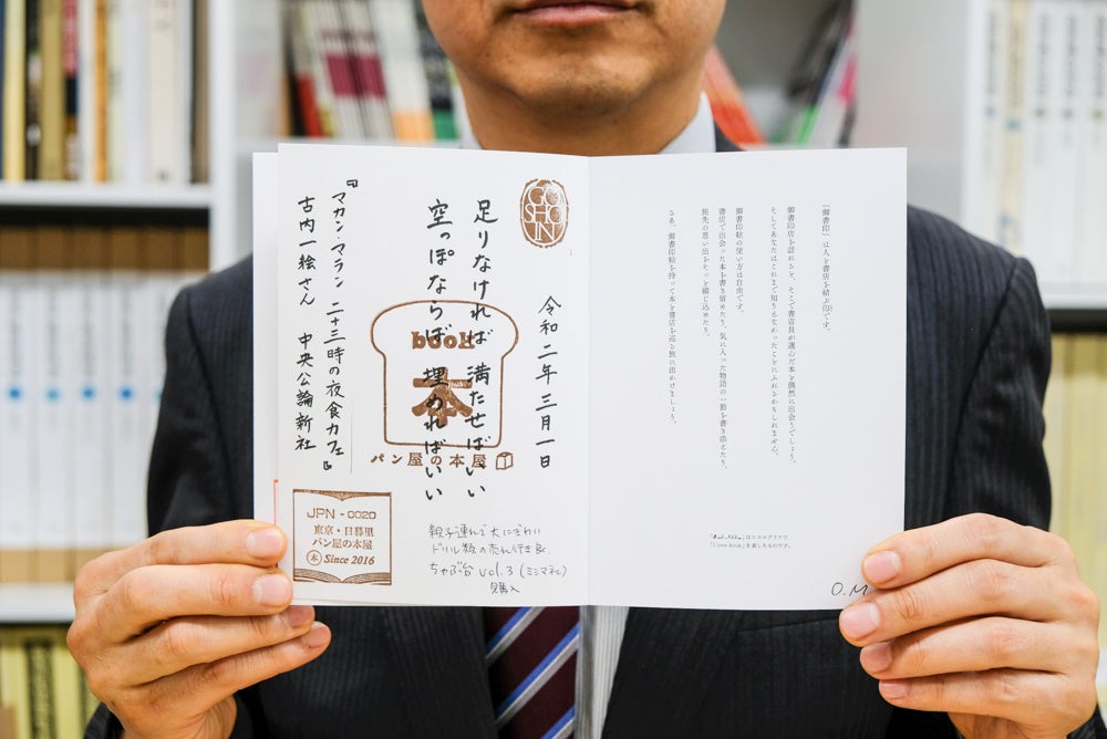 「御書印」とは「人と書店を結ぶ印」のこと。全国の御書印参加店で「御書印ください」とお願いすると、書店のオリジナル印を含む3つの印が捺され、訪問した日付と書店員が選んだフレーズ(縁のある本のタイトルや一節、キャッチフレーズなど)が記入されます。