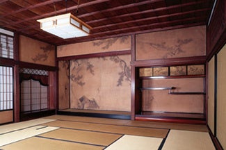 室内に描かれている墨画は、天明4年(1784)、円山応挙(まるやまおうきょ、1733~1795)が明眼院に眼病で滞留していた際に揮亳したものであると伝えられています。松竹梅を描いた床張付が残されています。