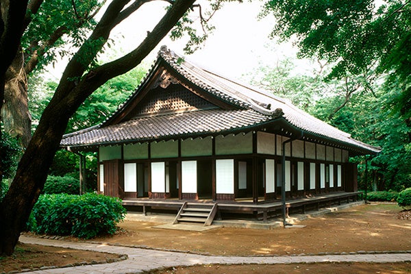 尾張国(現在の愛知県大治町)の天台宗寺院、明眼院の書院として寛保2年(1742)に建てられ、後に東京品川の益田孝(鈍翁・ 1848~1938)邸内に移築、昭和8年(1933)東京国立博物館に寄贈され、現在の位置に移されました。