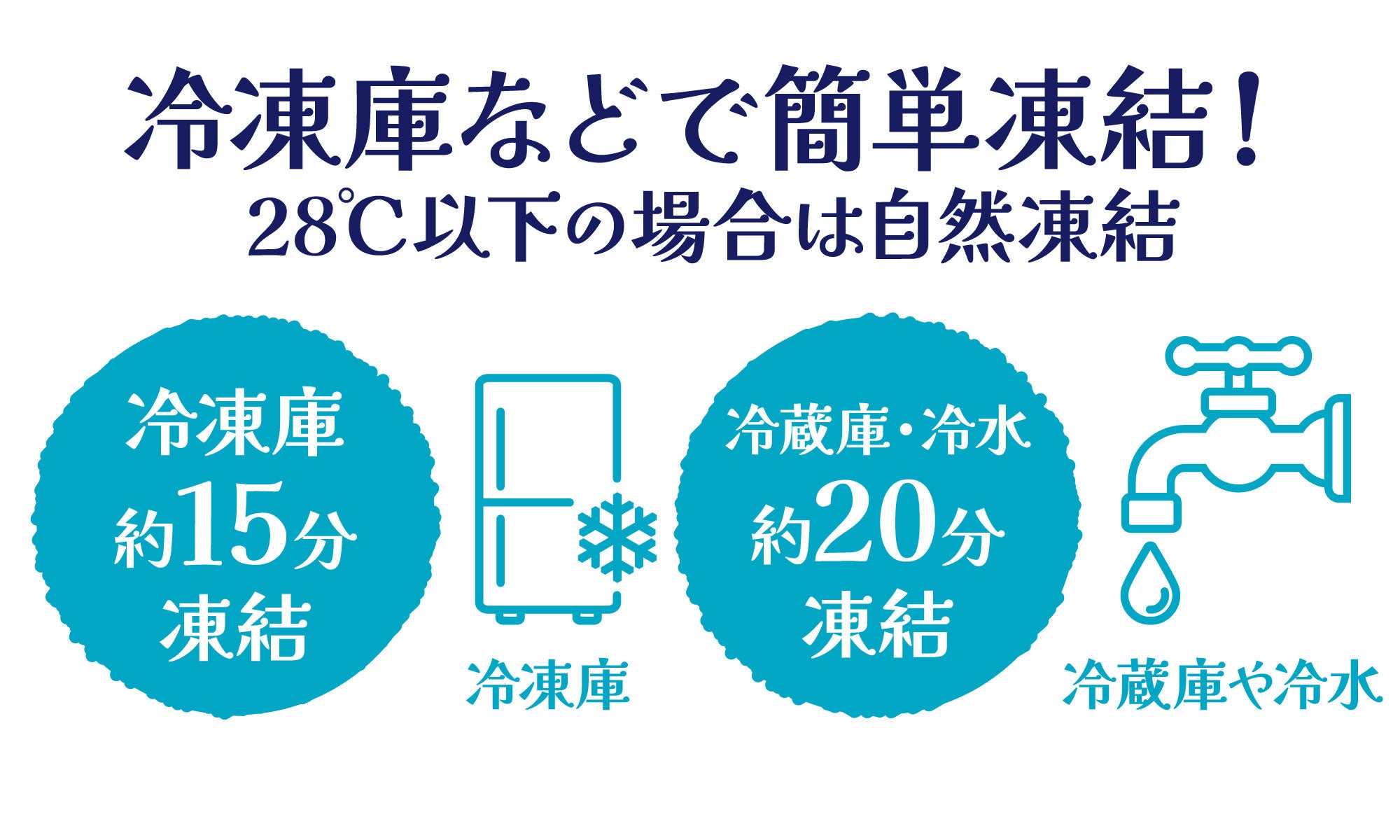 冷蔵庫・冷水の場合約20分、冷凍庫の場合約15分で中材が凍結します。28℃以下の場合は自然凍結します。
