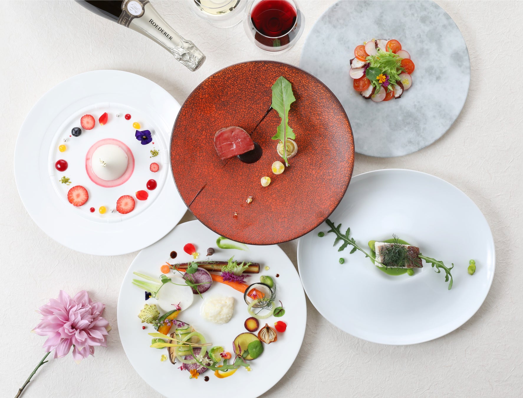 3月は、紅芯大根、菜の花、スナップエンドウ、春人参をはじめとした彩り豊かな岡山の旬の新鮮野菜を使用。シェリーヴィネガー、オリーブの味わいを野菜に纏わせるなどし、野菜そのものの味わいを活かした、岡山の春の菜園を表現した華やかな一皿です。