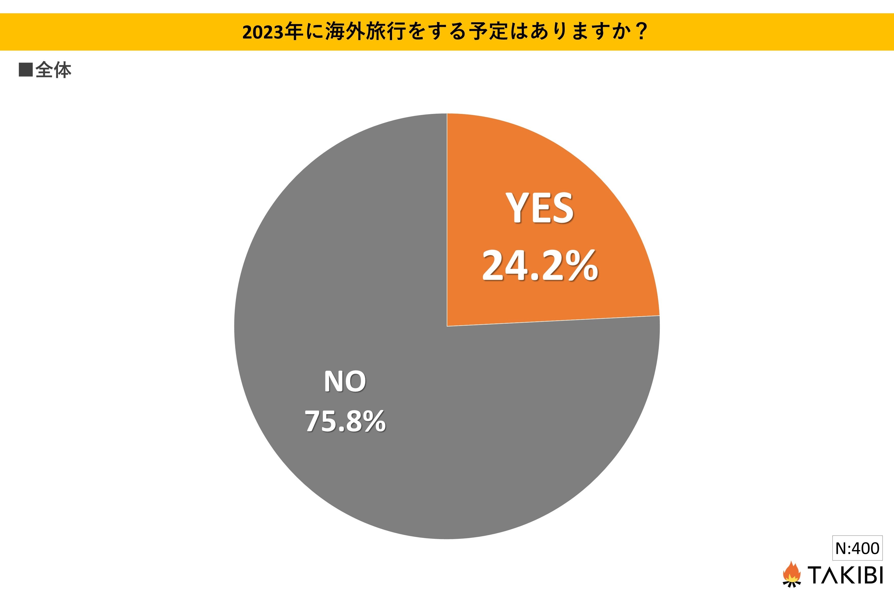 全国の10代~60代の男女を対象とした「2023年に海外旅行をする予定はありますか?」というアンケートを行ったところ、「YES」と回答した方が24.2%という結果になりました。