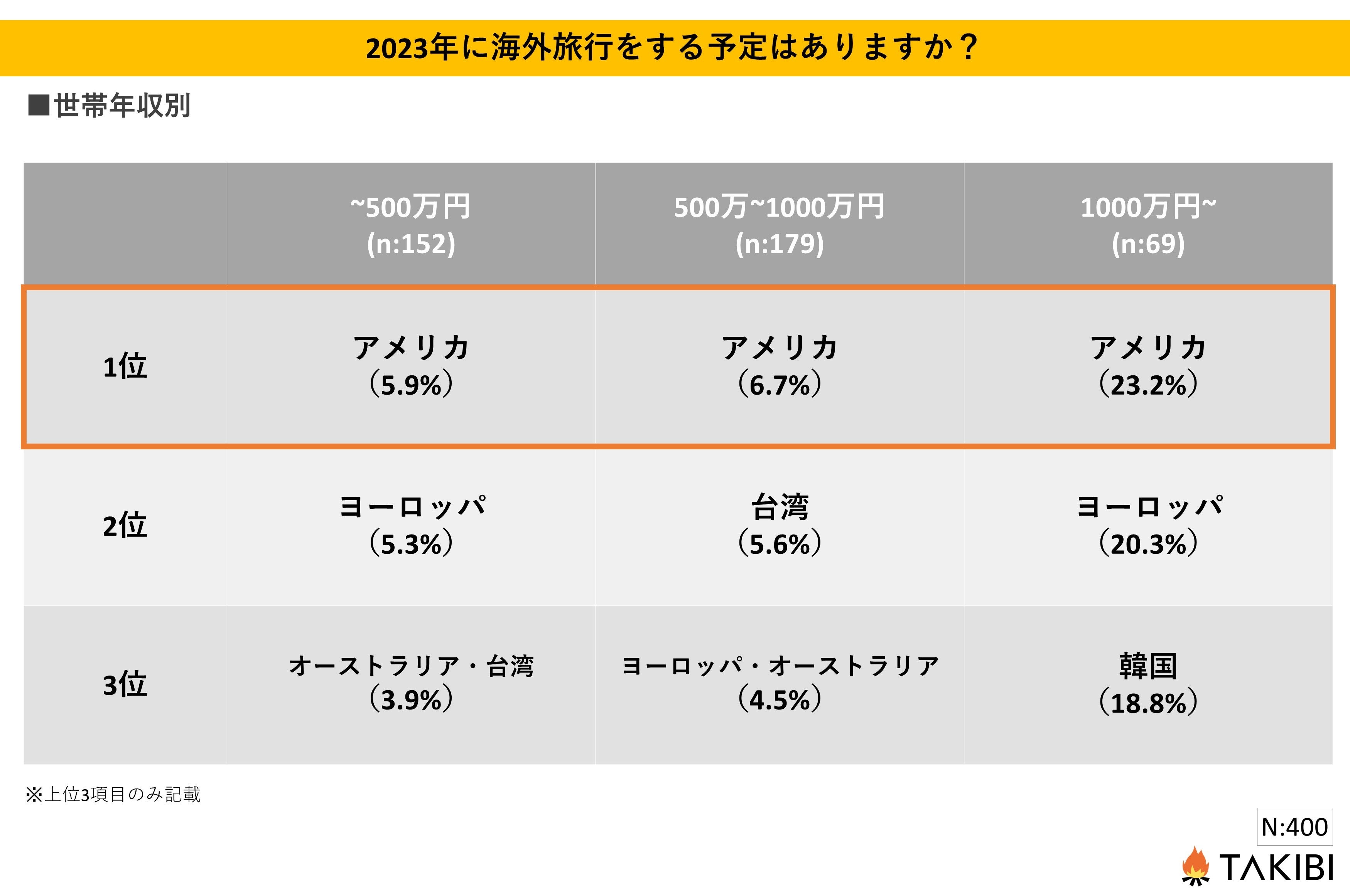 渡航先の内訳を見て見ると、どの年収層でも「アメリカ」が1位にランクインする形となりました。