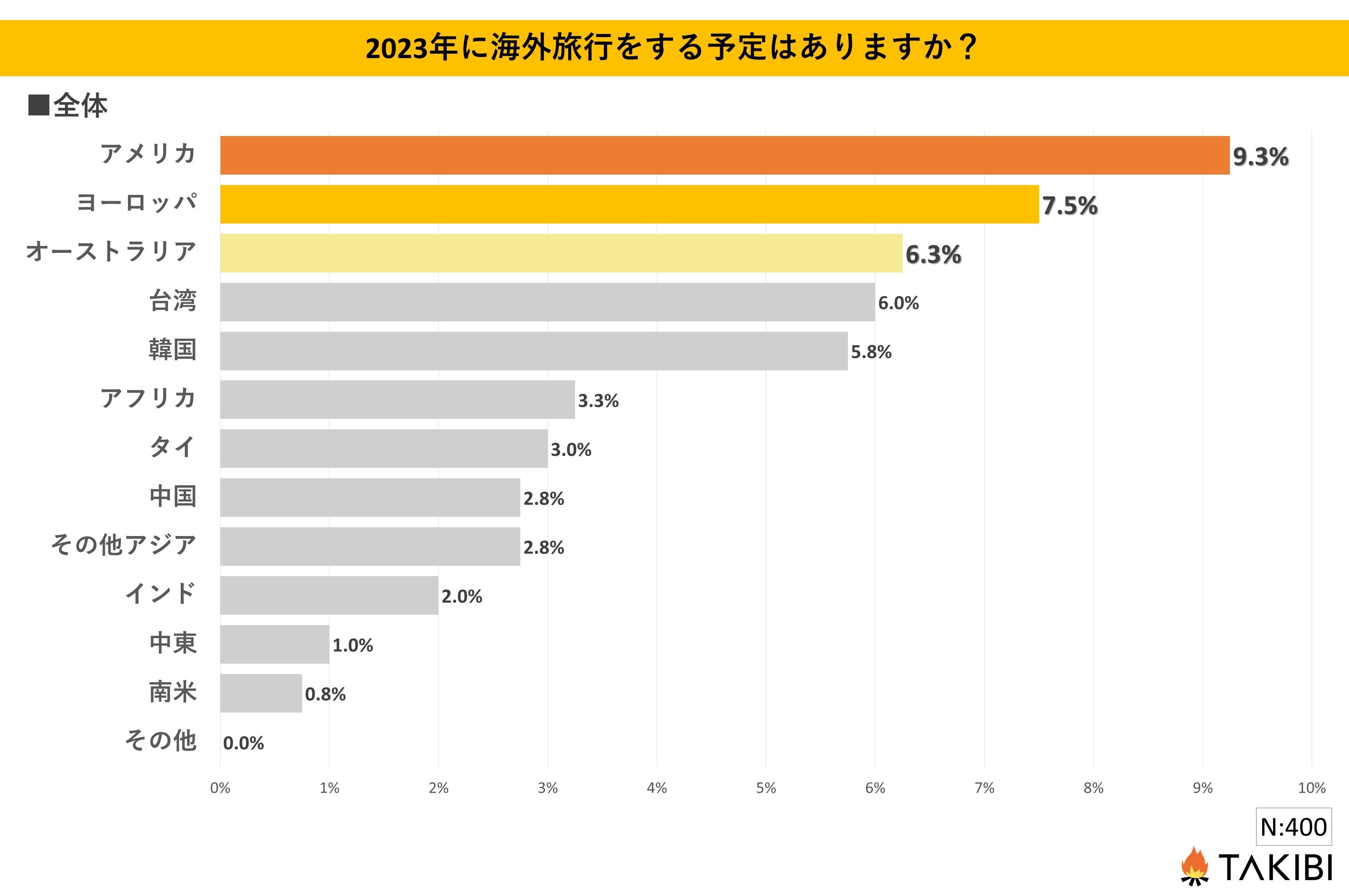 最も多かった回答は「アメリカ」で9.3%となりました。次いで、「ヨーロッパ」が7.5%、「オーストラリア」が6.3%と続きました。