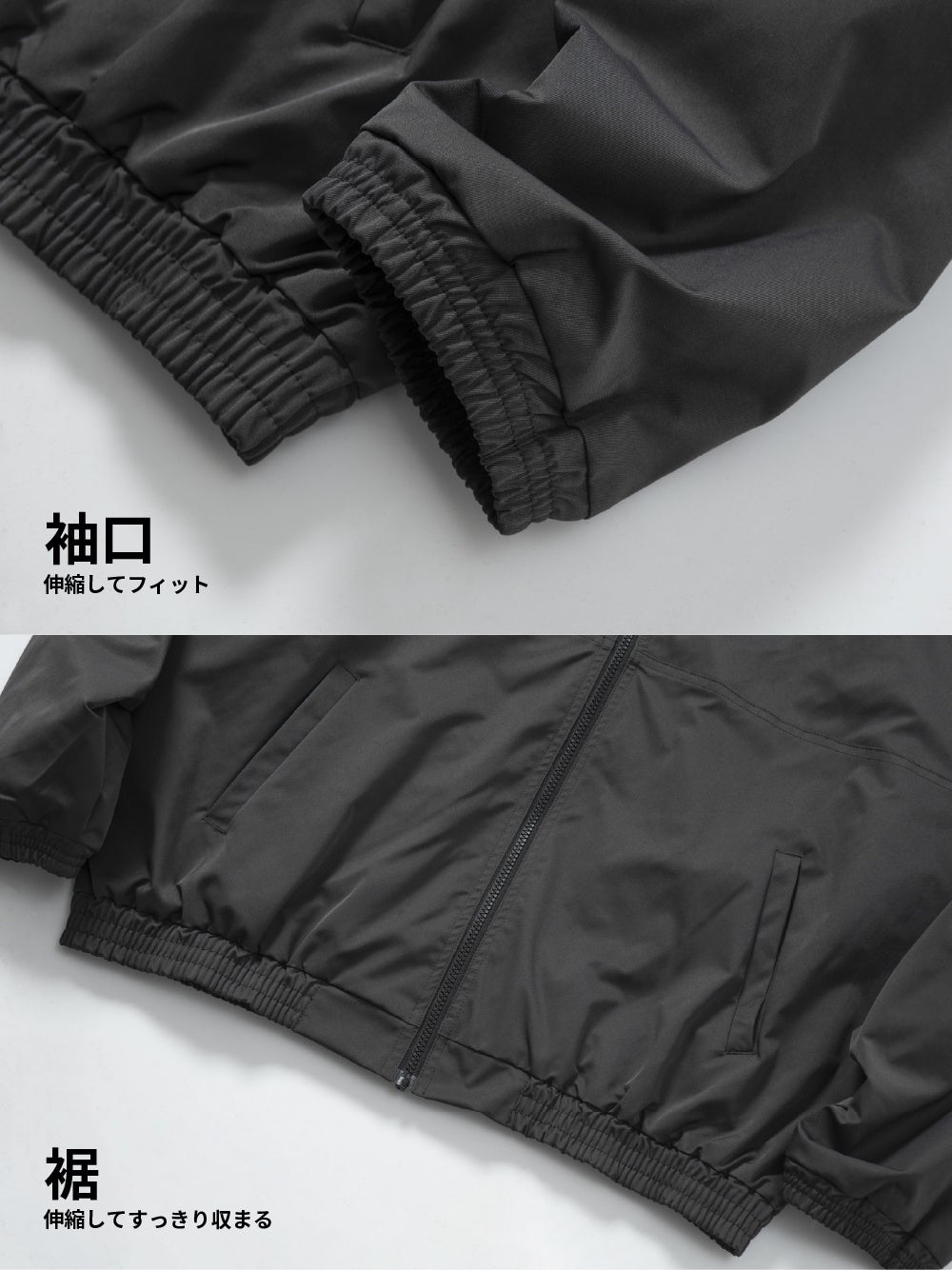 YKKのファスナーと、伸縮性のある袖口と裾で、アウトドアやスポーツでも動きやすい形状です。