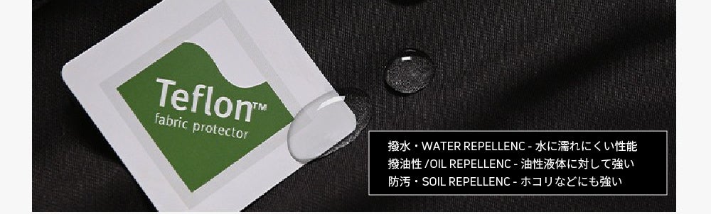 GeeTransientは、撥水性が高く、汚れにも強いテフロン素材を表生地に採用。