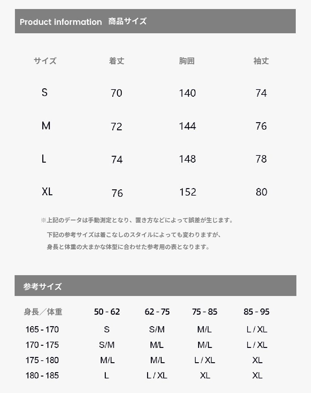 - ブラックとグレーの2色カラーバリエーション、メンズ用S・M・L・XLサイズ展開