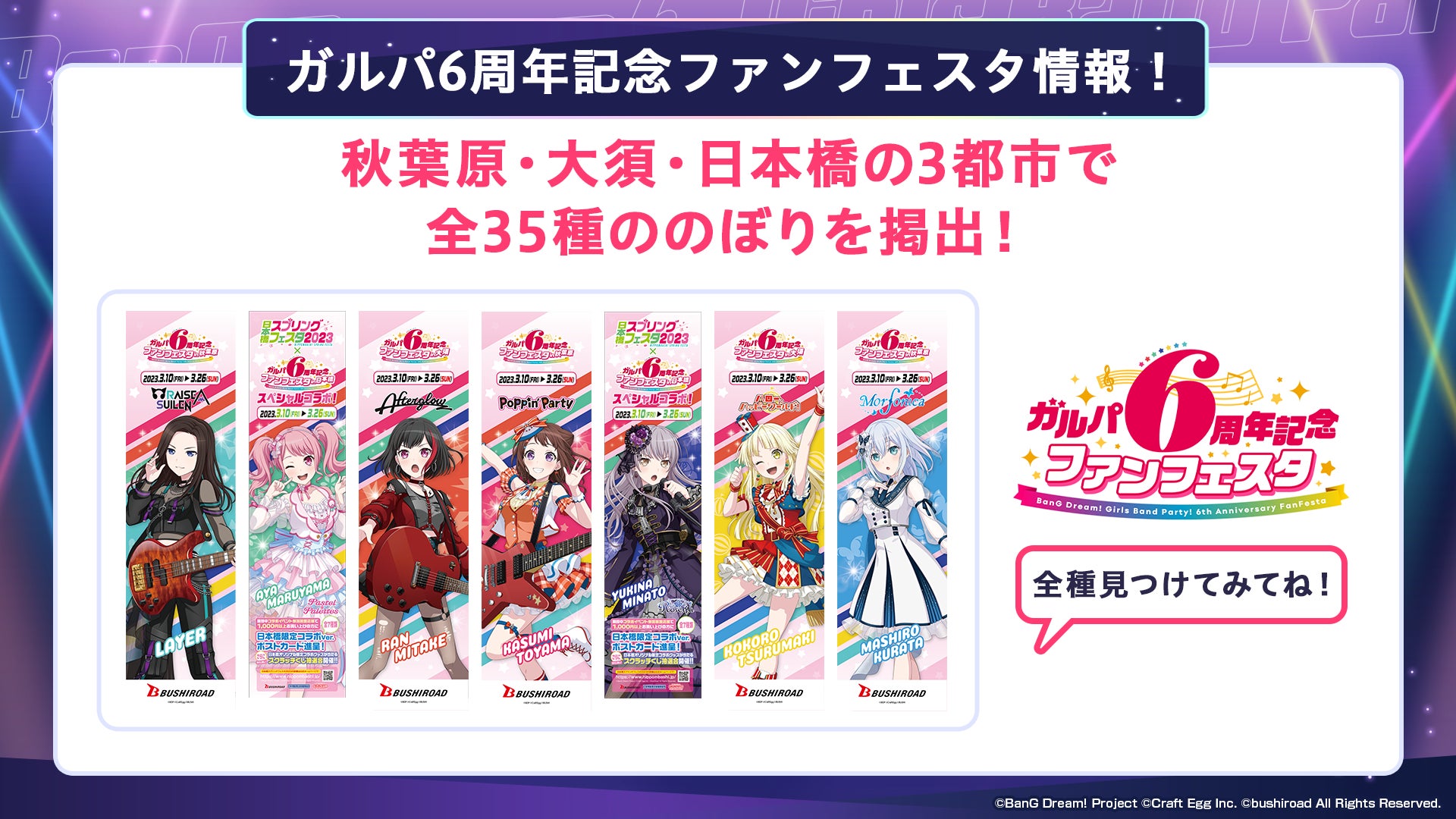 2023年3月18日(土)〜3月19日(日)に開催する「ガルパ6周年記念ファンフェスタ in 秋葉原」と連動し、東京の秋葉原・名古屋の大須・大阪の日本橋の3つのエリアで「ガルパ6周年記念ファンフェスタ」を開催いたします。開催エリアではガルパ6周年を記念したポスターやのぼりで街中をジャックいたします。