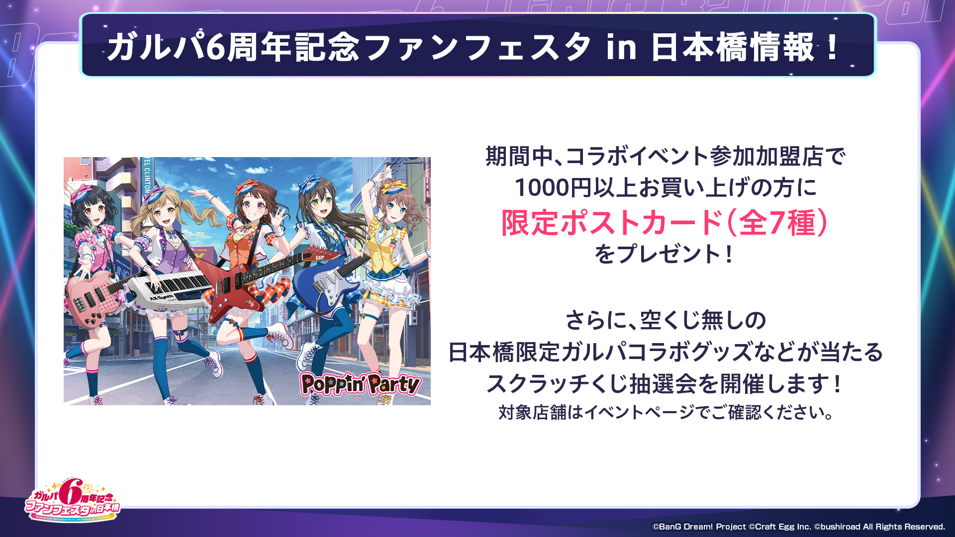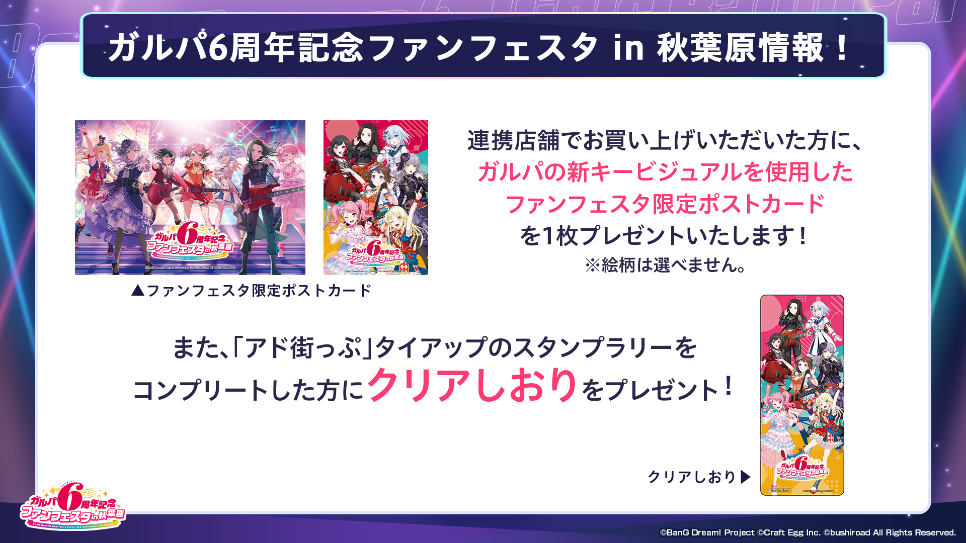 連携店舗でのお買い物で、ガルパの新キービジュアルを使用した「ファンフェスタ限定ポストカード」を1枚プレゼントいたします。連携店舗の詳細は、後日公式サイトにて発表いたします。