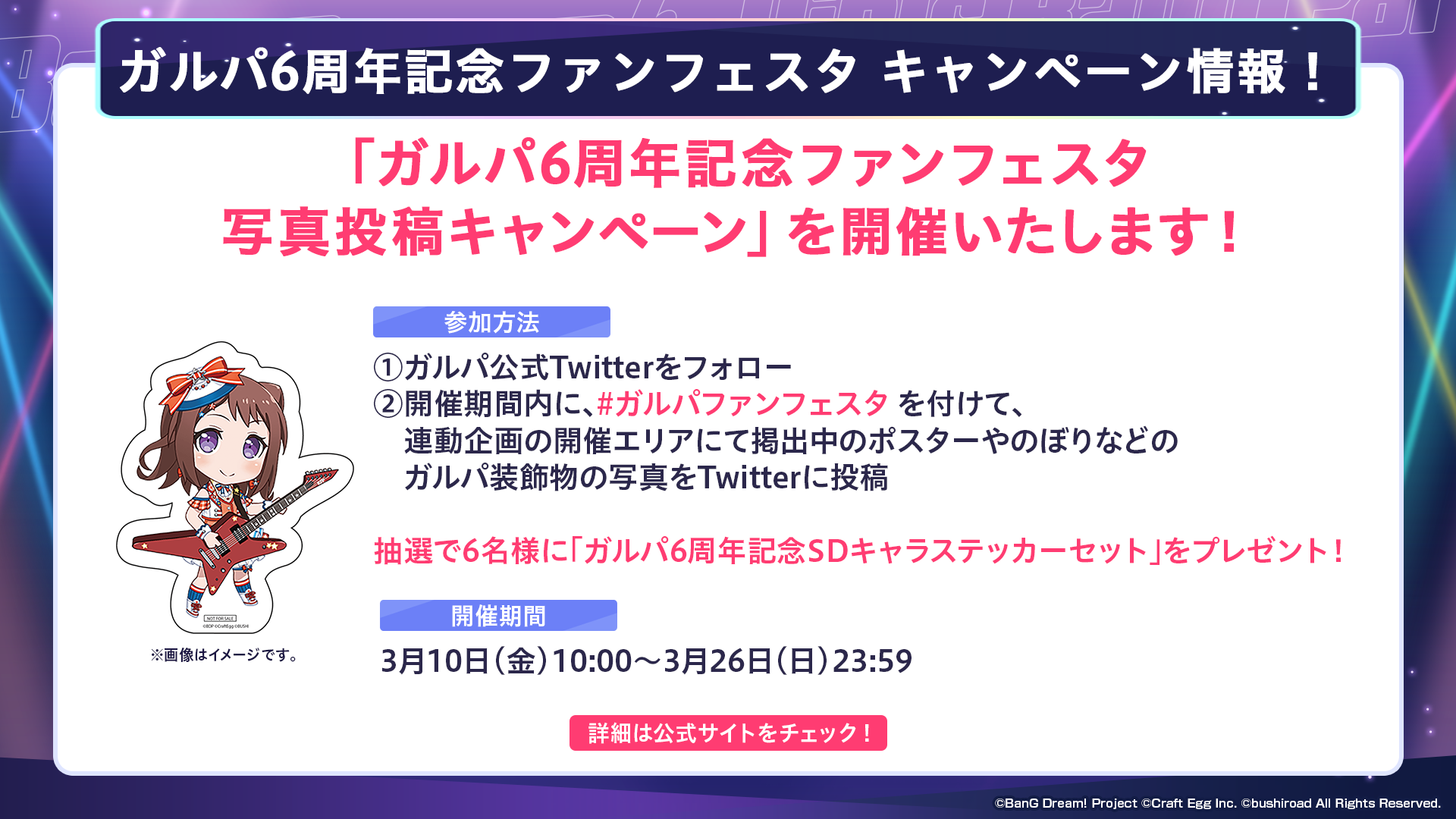 開催期間中にガルパ公式Twitter(@bang_dream_gbp)をフォローし、「#ガルパファンフェスタ」を付けて、連動企画の開催エリアにて掲出中のポスターやのぼりなどのガルパ装飾物の写真をTwitterに投稿していただいた方の中から、抽選で6名様に「ガルパ6周年記念SDキャラステッカーセット」をプレゼントいたします。