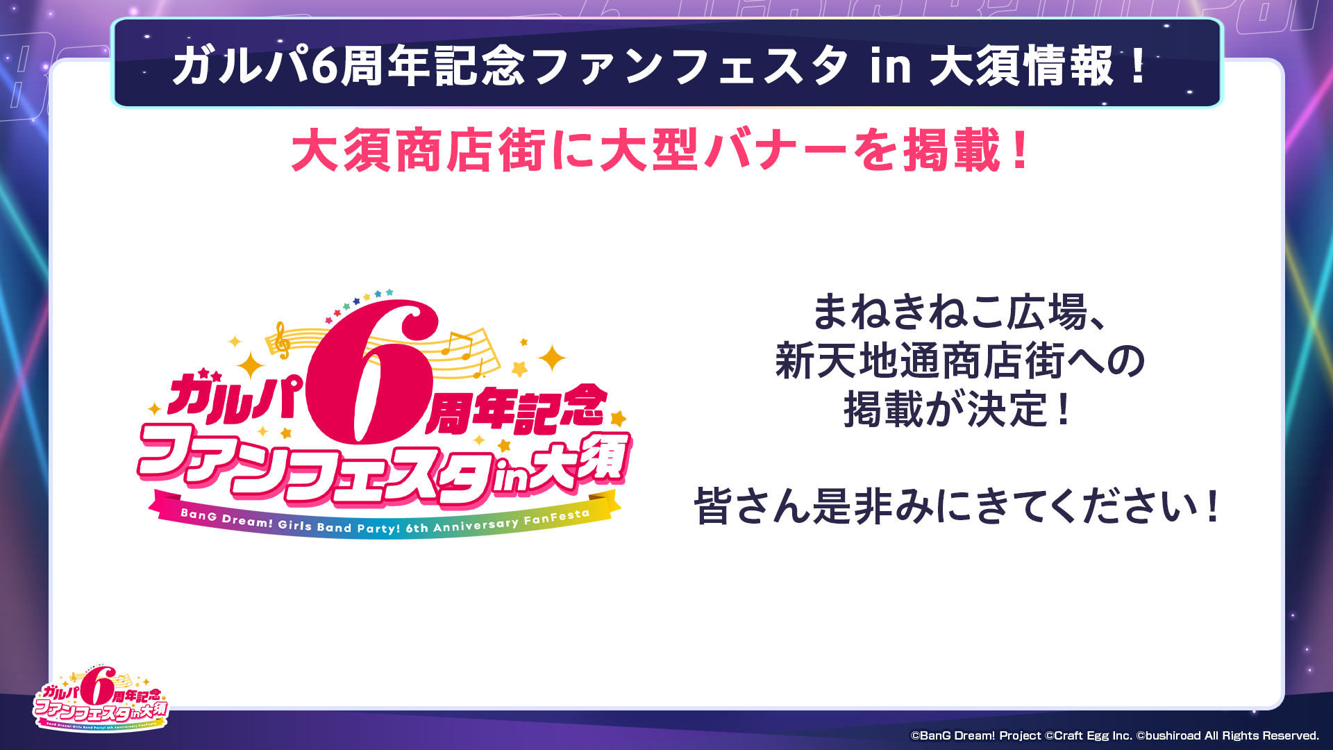 2023年3月18日(土)〜3月19日(日)に開催する「ガルパ6周年記念ファンフェスタ in 秋葉原」と連動し、東京の秋葉原・名古屋の大須・大阪の日本橋の3つのエリアで「ガルパ6周年記念ファンフェスタ」を開催いたします。開催エリアではガルパ6周年を記念したポスターやのぼりで街中をジャックいたします。