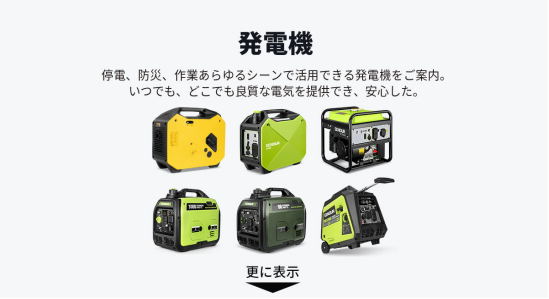 取扱い商品:ポータブル電源、ソーラーパネル、発電機、電動工具、照明器具、他